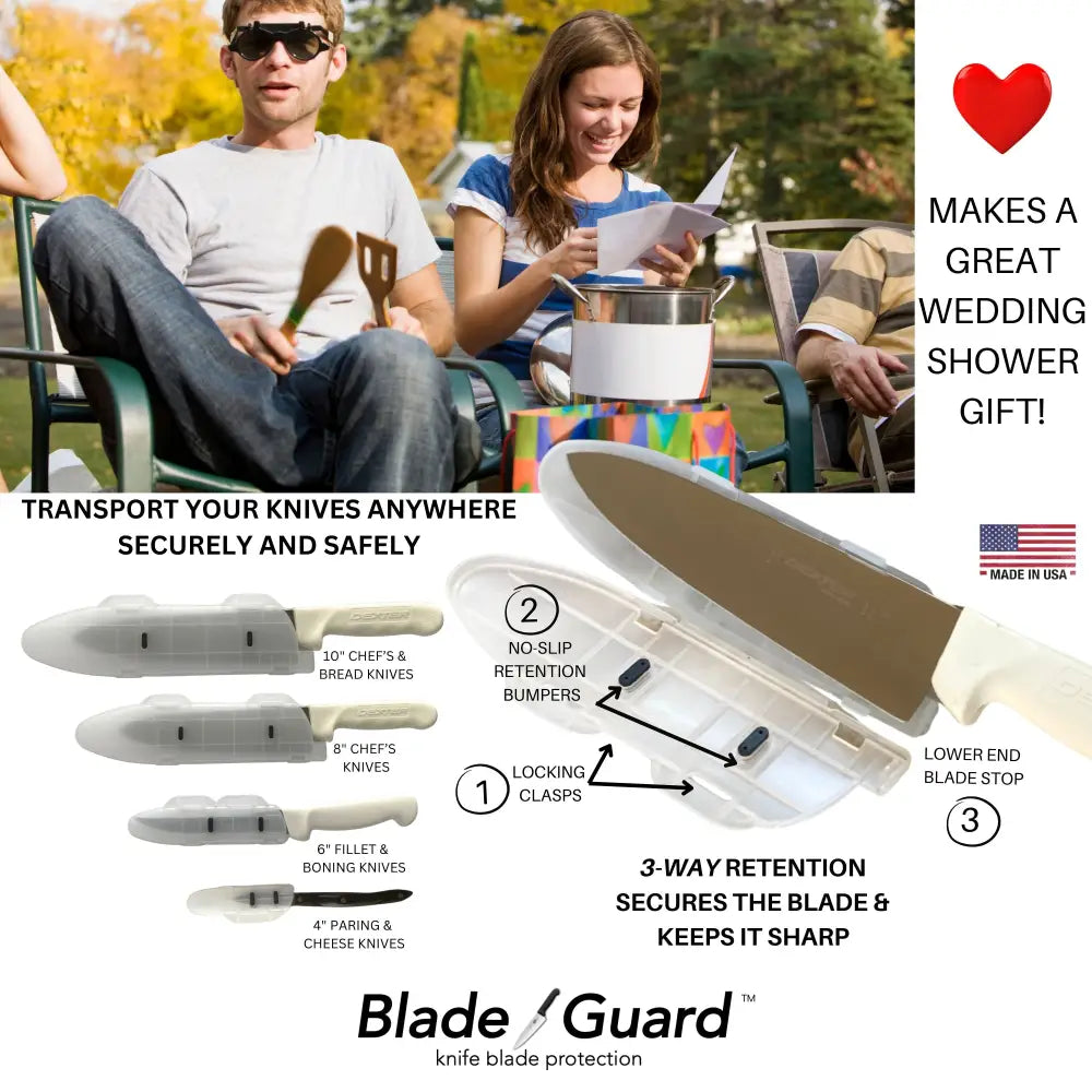 The Blade Guard 4-Inch Knife Edge Guard provides precision protection for your small kitchen knives and specialty blades. Designed for 3-4" blades including paring knives, utility knives, and small chef knives, this hinged guard features a patented locking latch system with transparent BPA-free construction. Made in the USA for superior quality and durability.