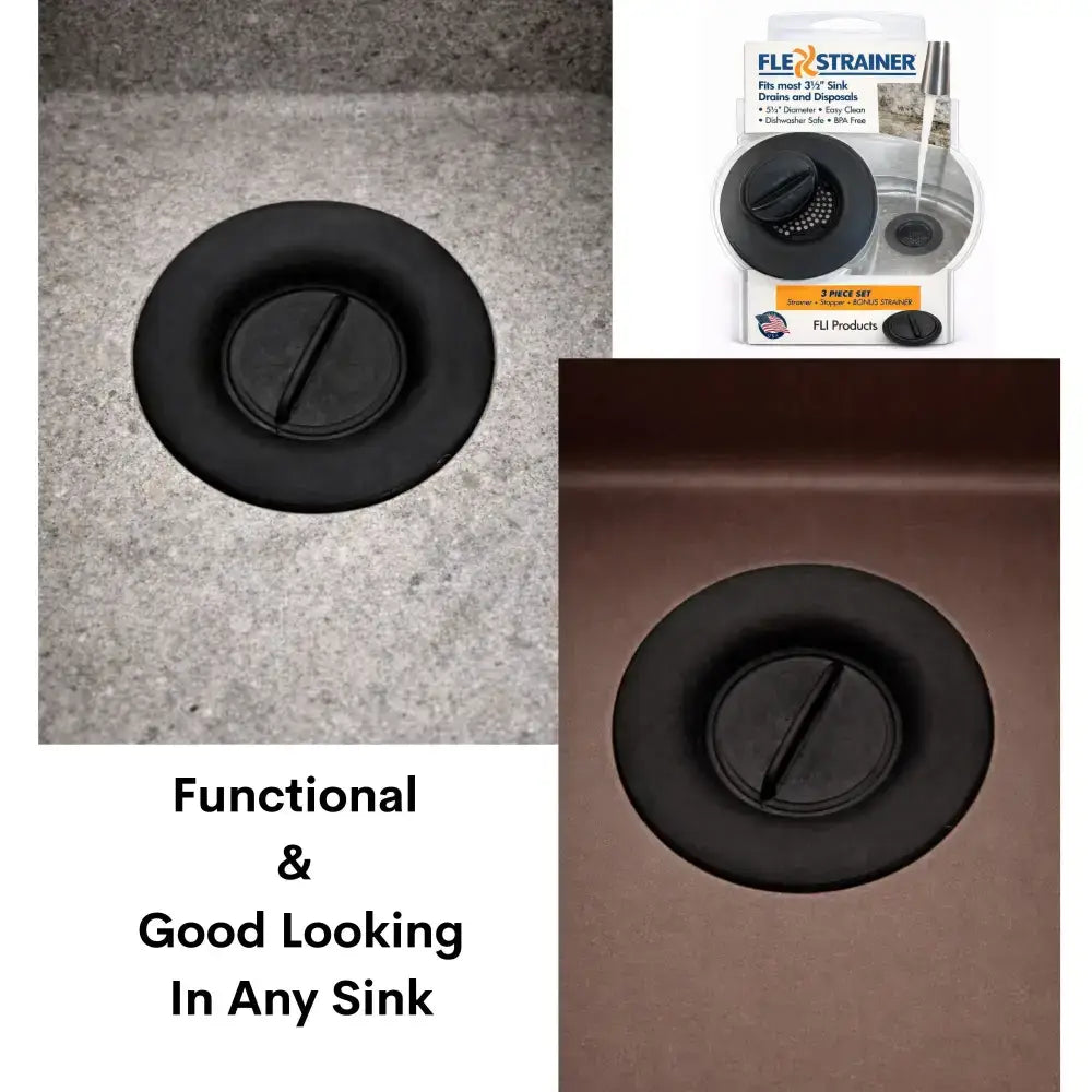 The Flex Strainer 3-piece value set includes 2 full strainers plus 1 stopper, providing complete coverage for double sinks or a backup replacement for single sinks. Available in Black or Grey to match your kitchen aesthetic, all pieces are BPA-free, dishwasher safe, and Made in USA with the same premium thermoplastic construction.