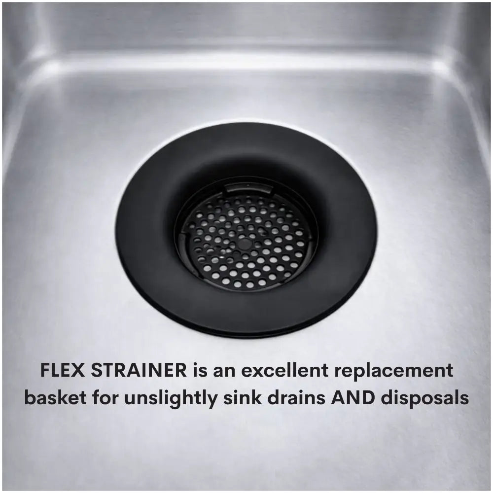 The Flex Strainer is a flexible sink strainer designed to catch food debris while allowing water to drain freely. This strainer-only version features a no center stem design with a wide 1.5-inch deep basket that captures food particles effectively. Simply place it in your drain, and when full, lift it out, dump the debris, and rinse clean.